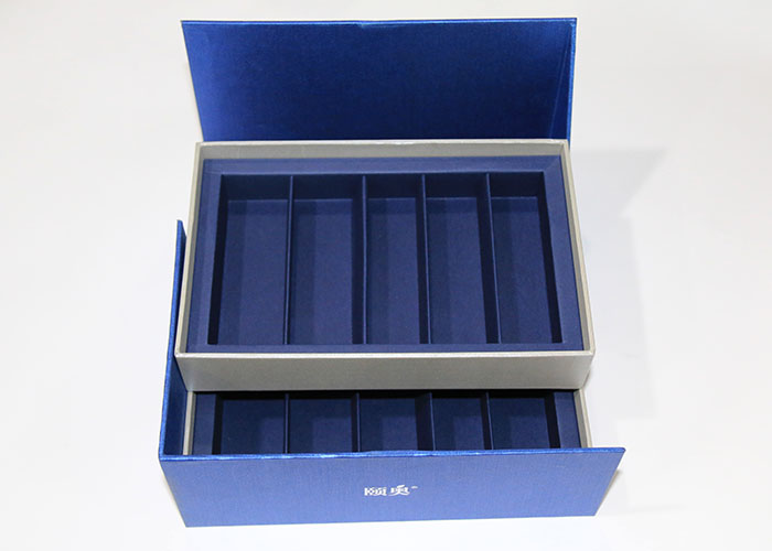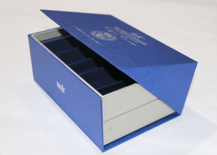 1.材質:面紙採用180G藍色塗布特種紙,絲印白墨文字,内包材質1600G雙灰闆,盒型爲半翻蓋雙層抽屜盒型,整個盒子都是手工精細制作
