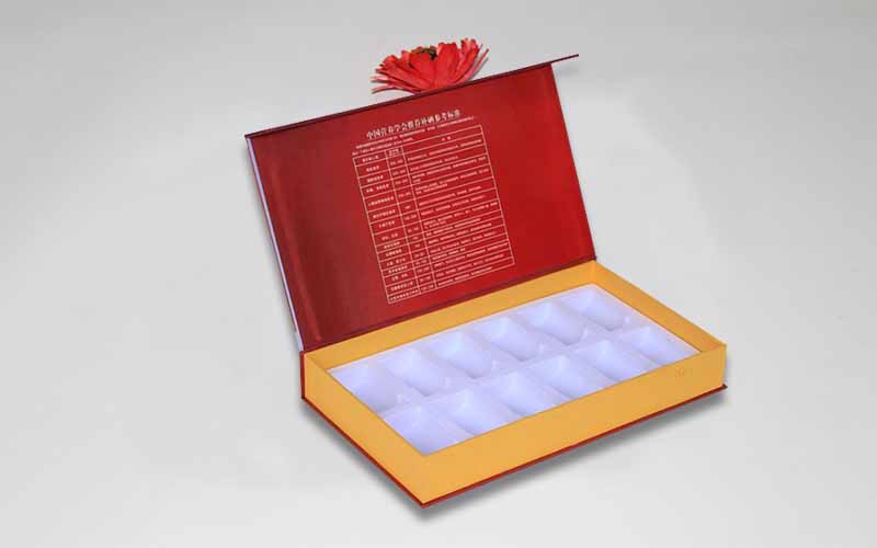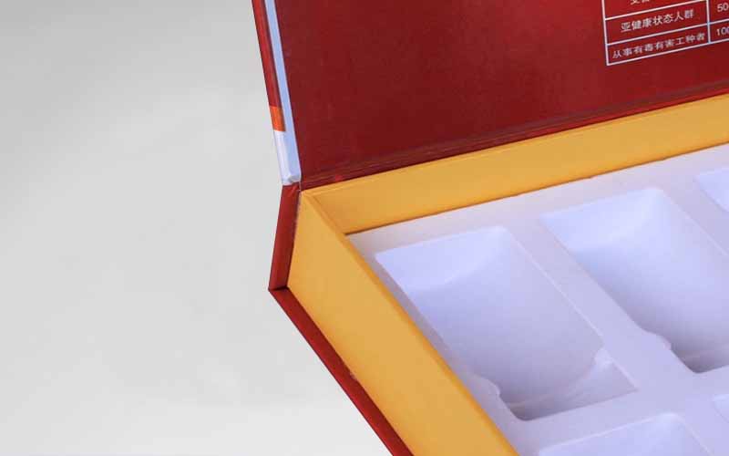 1.材質 :盒子面紙採用金卡紙彩色印刷,單面啞膜。文字UV擊凸工藝,裱1200G雙灰闆,内盒用金色萊利紋材質裱1200G雙灰闆,内托用白色吸塑開槽固定産品,機械化制作成品。