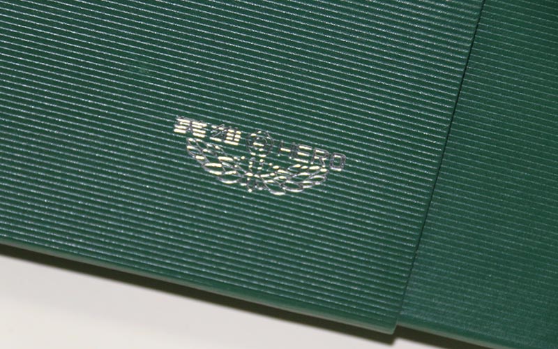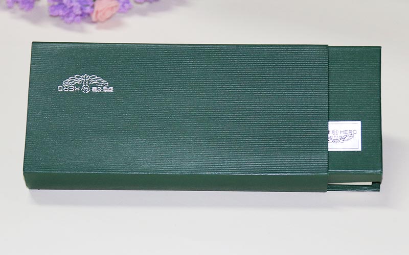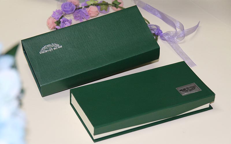 材質:鋼筆禮品盒定制外盒封套採用250G綠色特種紙壓紋路,表面文字LOGO燙銀,盒子皮殼用180G綠的特種紙壓紋路,表面文字絲印白色,盒内蓋子手工貼異型産品,文字燙印,下盒内托用EVA開産品模型裱綢布 。盒型爲翻蓋盒此款盒子是精簡版抽屜盒