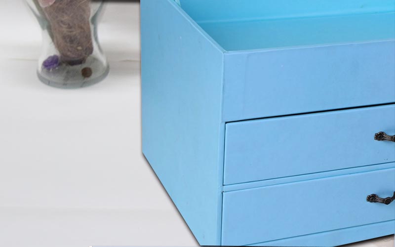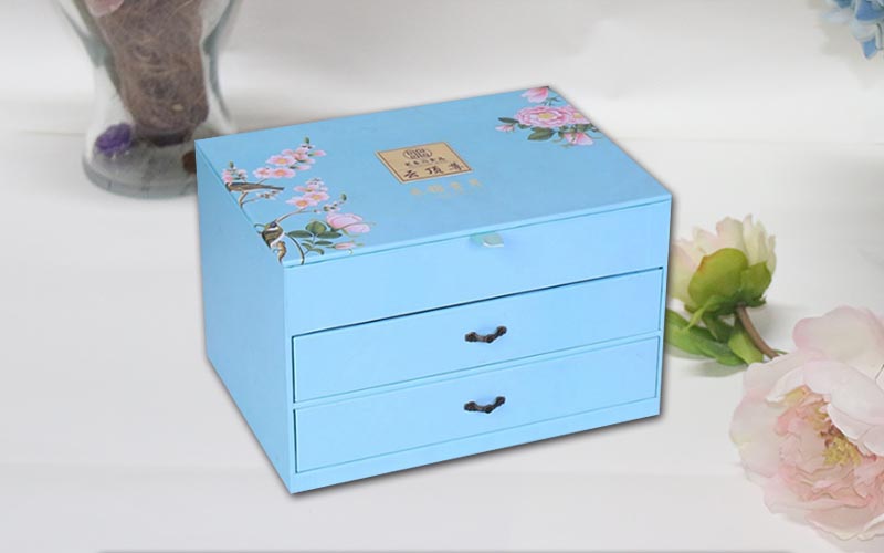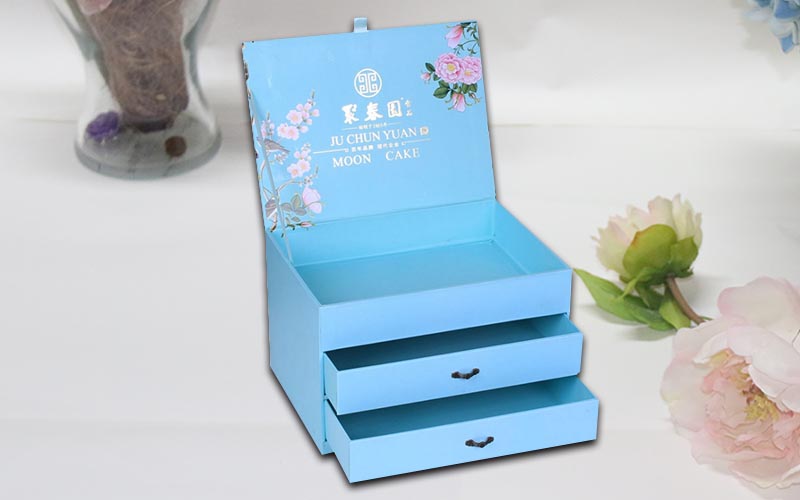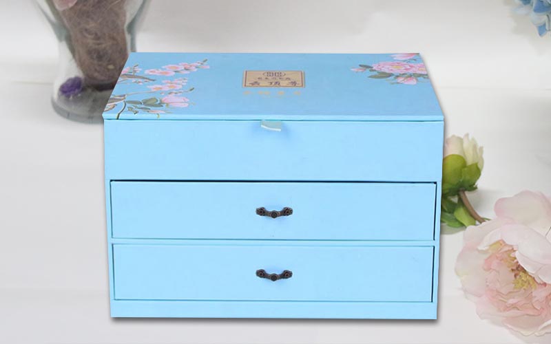 1.材質 :盒子面紙用157G銅版紙 ,單面彩色印刷,過觸感膜,裱1800G雙灰闆,盒子結構爲翻蓋抽屜盒,兩層抽屜盒裝複古的手拉扣,盒子裏面也是用一樣的材質工藝,整款盒子結構複雜都是手工制作 。