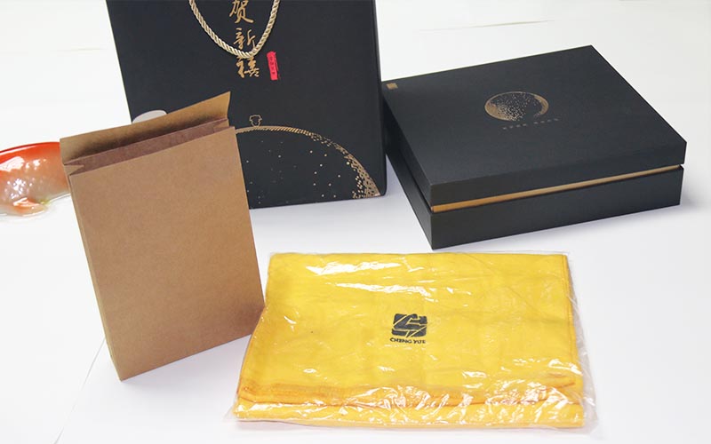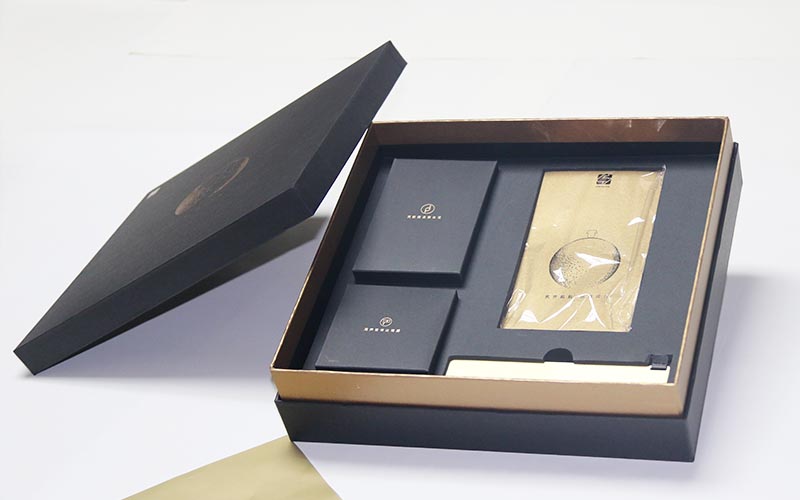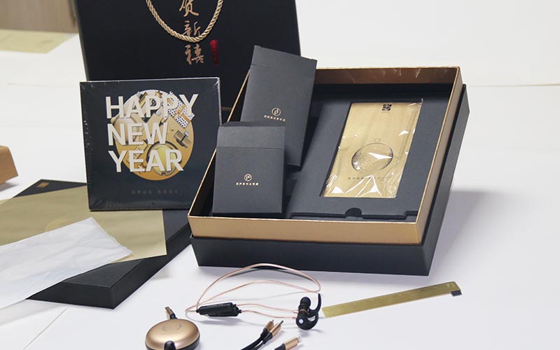1.材質:這款是客戶套裝禮品包裝盒,袋子220G黑色 卡紙燙黃金+紅金,盒子外面紙用120G牛皮紙燙金裱1200G單黑闆,盒子内圍條用金色特種紙,底盒上盒材質一樣 ,盒型爲天地盒,小配件的都是350G黑卡紙燙金,還有一本木架支撐的單頁台曆,裏面還有一款金色的紅包特别豪華的感覺。最後是一個牛皮紙袋子裝圍巾,整款盒子制作都是手工配裝。