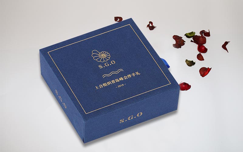 1.材質:盒子面紙採用小石頭紋的藍色特種紙,盒子表面文字LOGO燙金色,裱1200G單白闆,整體盒子爲抽屜盒性,抽拉的地方裝藍色的絲帶。整款盒子手工制作。