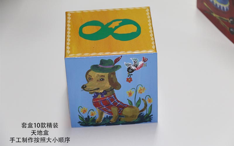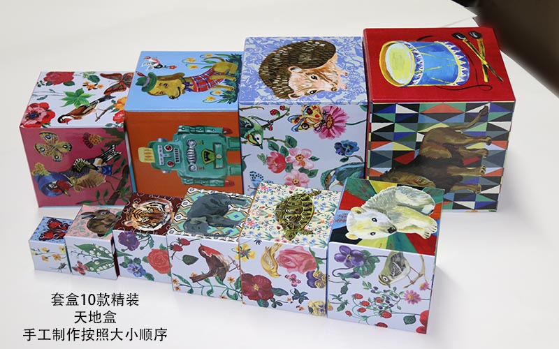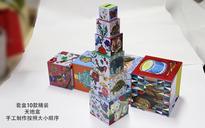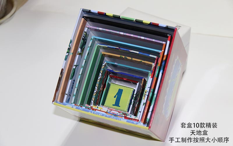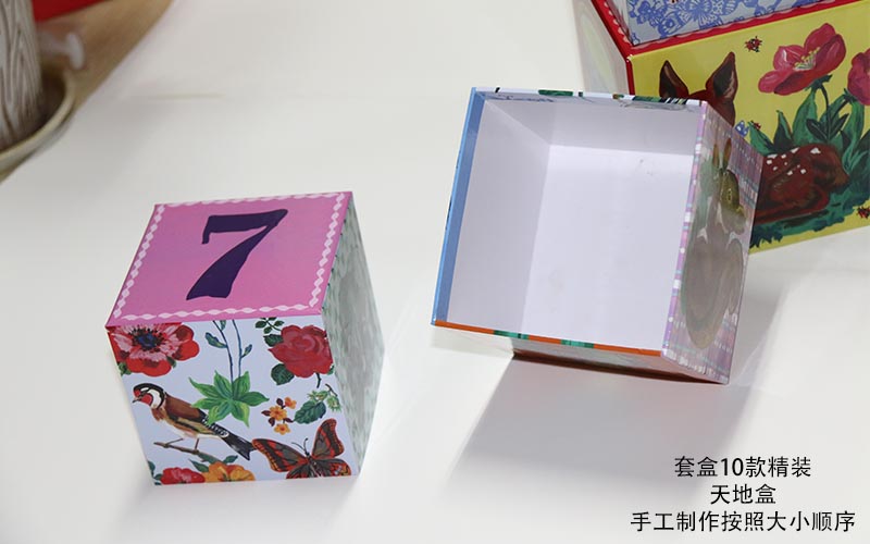1. 材質:盒子面紙彩色印刷表面過(guò)光膠裱1600G雙灰闆,都是手工制作的套盒,一款盒子共有10個(gè)盒子,越是到小的盒子手工越不好做