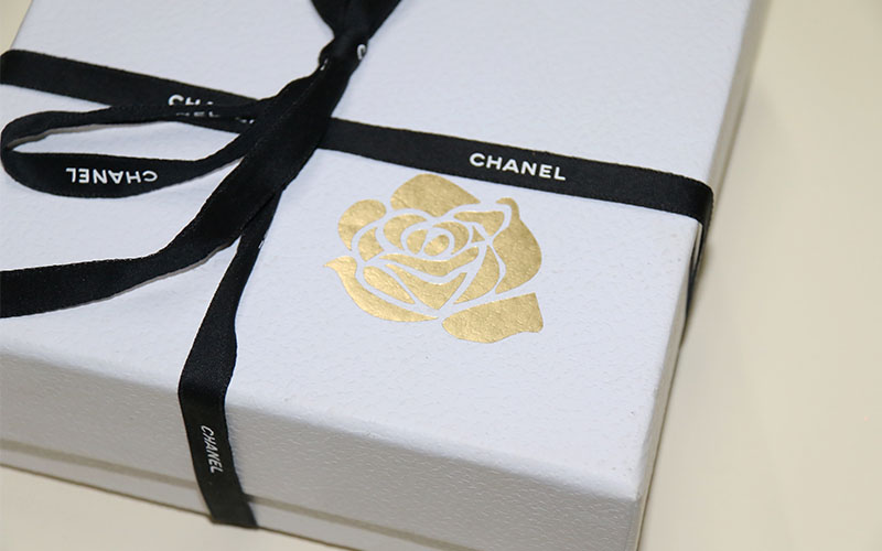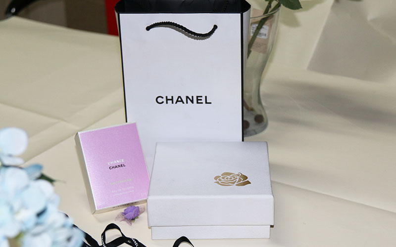 1.材質:品牌香水包裝盒定制,外盒材質採(cǎi)用180G白色特種紙 ,面紙燙(tàng)金色LOGO玫瑰花,(此款香水包裝盒高仿Chanel),盒内結構採用粉色香型拉斯草,盒型爲天地盒材質都一樣。組裝完系上彩帶蝴蝶結,香水包裝盒成型後裝入250G銅版紙做的手提袋内,手提袋單面啞膜,LOGO燙黑金激凸。