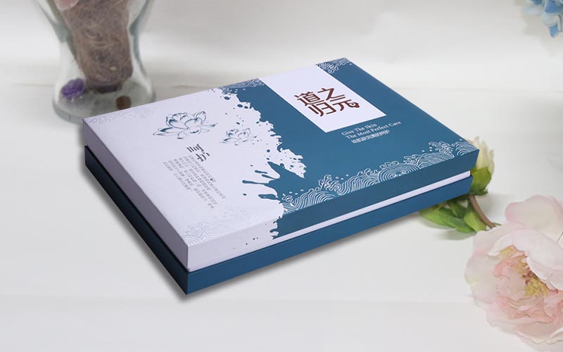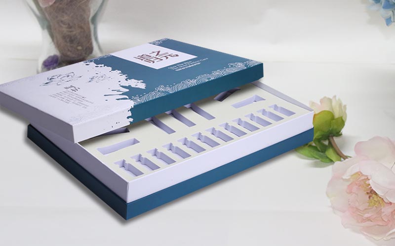 1.材質:盒子面紙採用白色珠光紙彩色印刷,裱1500G雙灰闆,下盒白色珠光紙藍色印刷裱1500G雙灰闆,中間純白色珠光紙裱1500G灰闆做圍條。内托用白色EVA,但是最重要的是盒子表面裱一層1MM厚度的海綿,盒子摸起來也會更有手感,整款盒子手工制作。
