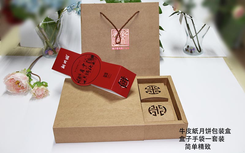 1.材質:此款月餅包裝盒盒子用400G美國進口牛卡紙,空白盒子+外封條銅版紙彩色印刷覆亞膜,内盒300G牛卡紙啤镂空成型,手袋200G牛卡紙燙紅金,穿棕色尼龍繩。